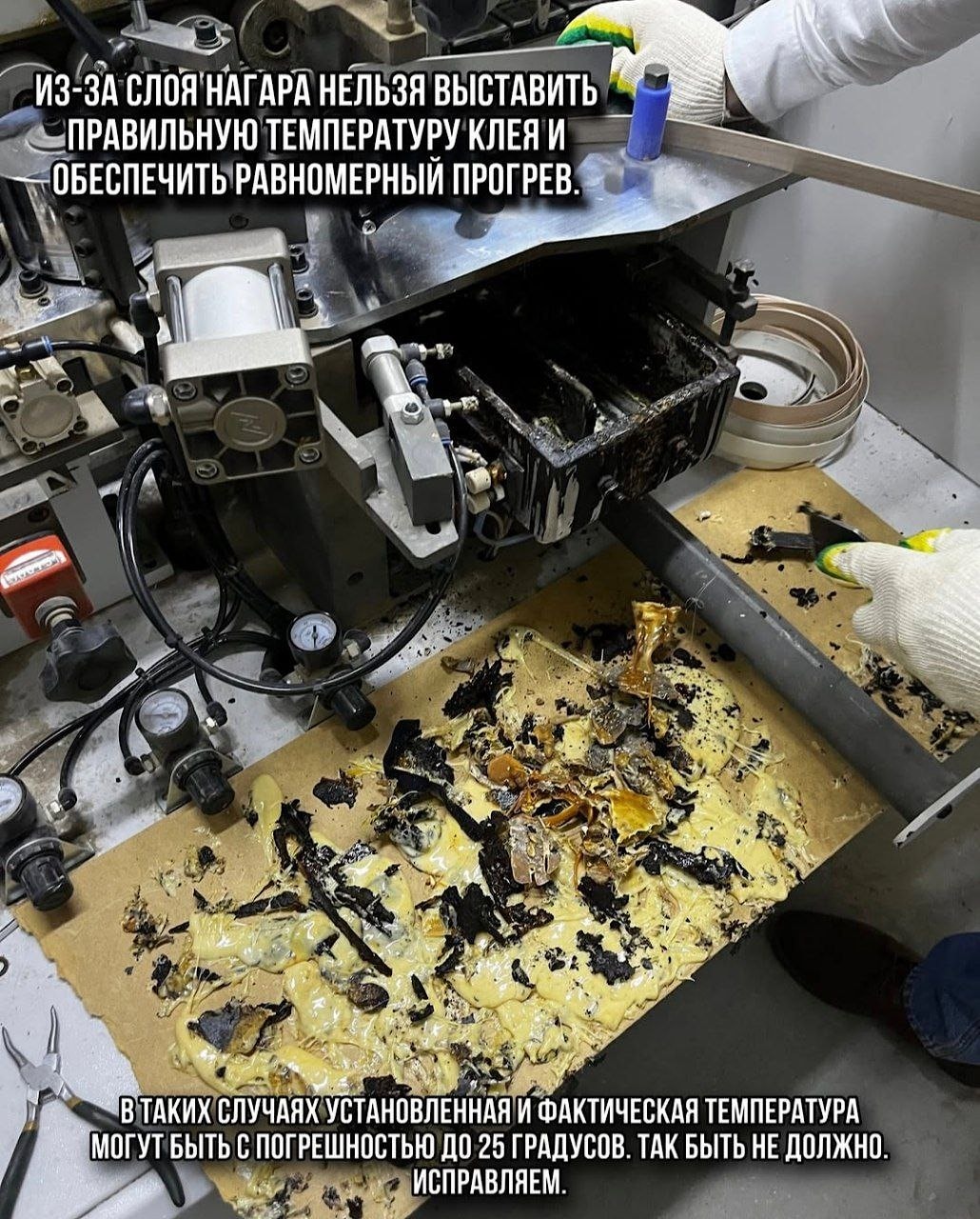 Клея сомнительного качества с грязью, высоконаполненные клея и неподходящие клея под технические характеристики кромкооблицовочного станка приведут к очередной незапланированной чистке, а еще хуже - к выходу из строя тэнов и других агрегатов.