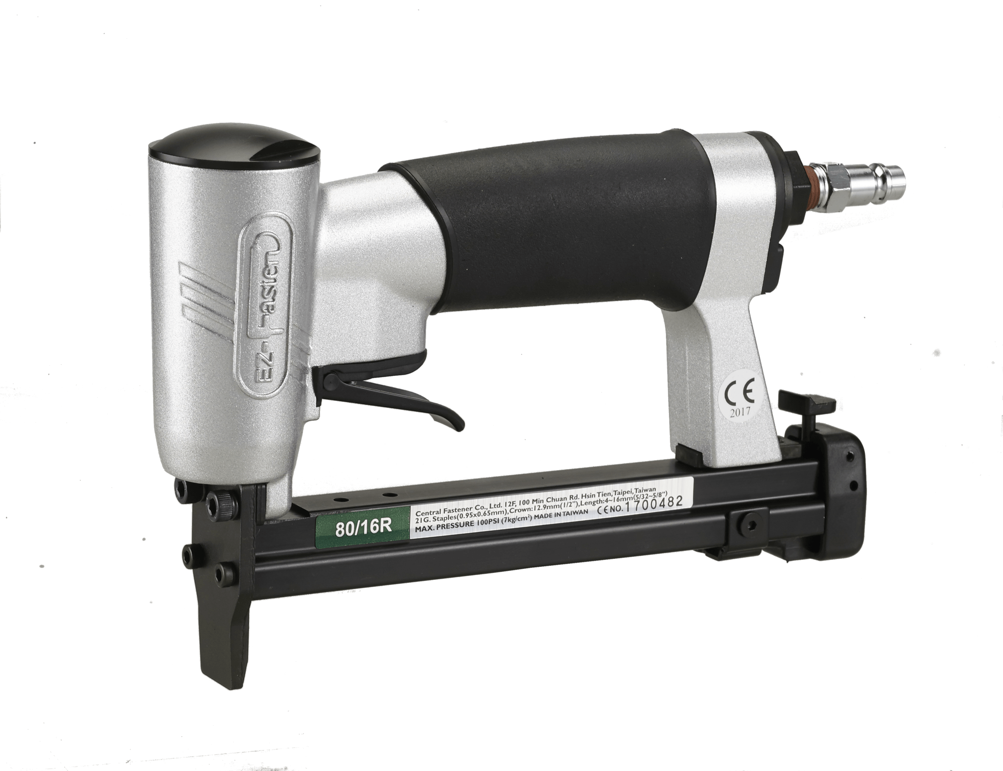 | Пневмопистолет EZ-Fasten 80/16LNR Особенность: удлиненное дуло Тип скобы: тип 380 (80, A, 115) Размер скобы: сечение 0,91x0,60 мм/ ширина 12,8 мм/ длина 4-16 мм Рабочее давление: 4 – 6 (макс.) Бар. Потребление воздуха: 0,31 литра / 6 Бар. Поступление воздуха (отверстие): 1/4". Размеры: 232×45×152 мм. Вес: 0,9 кг. | Для обивки мягкой мебели кожей, тканью, крепления ДВП в корпусной мебели и прочих отделочно-декоративных работ. Удлиненное дуло позволяет использовать для потайных скобяных швов. | ![]() |