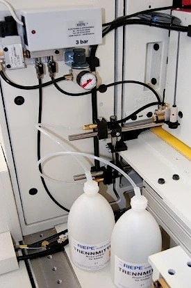 Распылитель для антистатик-охладителя может быть оснащен дополнительной тонкой форсункой. Данная форсунка предназначена для нанесения антиадгезива RIEPE NFLY‚ сбоку на поверхность кромочного материала. Таким образом, удается избежать повреждения ...